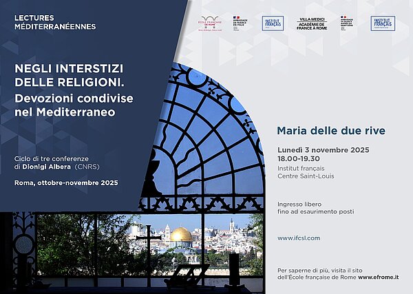 À l’occasion de l’exposition présentée à l’Académie de France à Rome - Villa Médicis du 10 octobre au 19 janvier, « Lieux saints partagés : voyage entre les religions », et en lien avec l’année jubilaire, l’École a invité Dionigi Albera, anthropologue et commissaire de l’exposition, à tenir le cycle de conférences annuel « Lectures méditerranéennes » sur le thème des dévotions partagées en Méditerranée. Vous pouvez dès à présent en écouter la conférence inaugurale qui portait sur l’île de Lampedusa (la collection de podcasts de l’EFR rassemble également les enregistrements des cycles précédents). Les « Lectures méditerranéennes » sont un événement de diffusion du savoir, créé par l'École en 2016, dans le but de partager les résultats des études les plus récentes en sciences humaines avec un public large et varié, en proposant des clés de lecture pour comprendre la complexité du monde qui nous entoure, les usages que les sociétés font du passé, les significations de notre patrimoine culturel à travers ses différentes significations et interprétations. Elles sont publiées dans une collection qui vient de faire peau neuve avec la parution des volumes de Claudia Moatti et de Giuliano Milani.