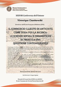 Une autre grande conférence, sur un sujet d’une brûlante actualité également, est au programme ce mois-ci. Véronique Chankowski, Directrice de l’École française d’Athènes, est en effet invitée par l’Unione internazionale degli Istituti di Archelogia Storia e Storia dell’Arte in Roma, composée de 38 académies et instituts, pour sa conférence annuelle qui se tiendra le 13 novembre à l’EFR. Le thème en sera le développement contemporain du trafic d'antiquités et les réponses pragmatiques qui peuvent être mises en œuvre pour la protection du patrimoine culturel, en lien avec deux projets européens réalisés (Netcher et Anchise) ces dix dernières années. L’Unione internazionale lance par ailleurs de nouvelles initiatives, de la numérisation de ses archives, prochainement accessibles en ligne, à la création de résidences de recherche pour de jeunes chercheurs souhaitant conduire un projet réunissant plusieurs des instituts qu’elle fédère. Elle célèbrera en 2026 son quatre-vingtième anniversaire avec un congrès mettant en lumière le patrimoine (édifices et collections) que ces instituts, italiens et étrangers, représentent au cœur de la ville de Rome.
