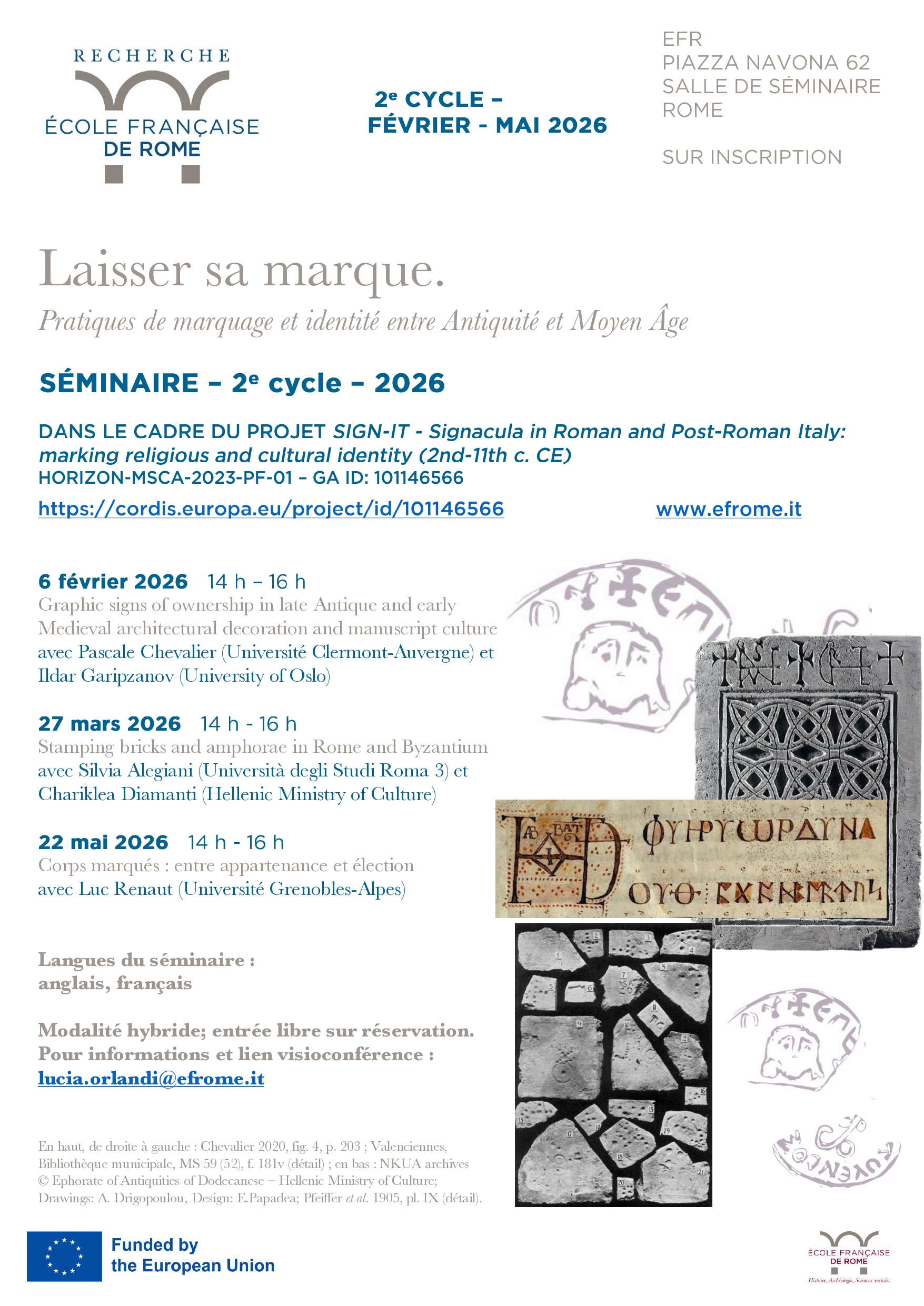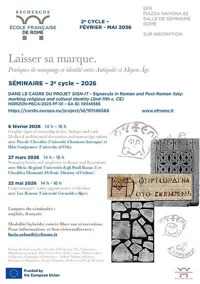 Séminaire organisé par Lucia Orlandi (École française de Rome) dans le cadre du projet MSCA SIGN-IT - Signacula in Roman and Post-Roman Italy: marking religious and cultural identity (2nd-11th c. CE)