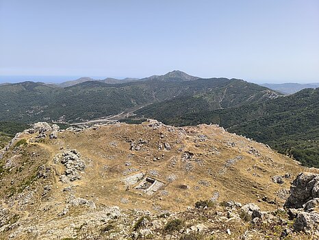 Illustration : Rocca Novara ou Salvatesta (Novara di Sicilia, ME). La partie septentrionale de la forteresse avec une partie des sondages ouverts entre 2023 et 2025 (cliché M. Messina).