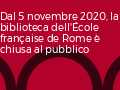 In adempimento del DPCM del 3 novembre 2020, si avvisa che dal 5 novembre p.v. la biblioteca dell’École française de Rome resterà chiusa al pubblico fino a nuove disposizioni. Maggiori informazioni…