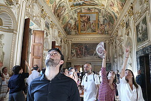 Puis, les 26 et 27 septembre, à l'occasion des journées européennes du patrimoine, la commémoration d’un double cent-cinquantenaire a mobilisé les énergies de nos équipes : celui du décret du 20 novembre 1875, qui donna à l’École française de Rome ses premiers statuts et le nom qu’elle conserve encore aujourd’hui et celui également de son installation au second étage du palais Farnèse en décembre de la même année. De nombreux intervenants se sont attachés, au cours des tables rondes et des ateliers de la « Nuit des 150 ans », à faire connaître à un public varié l’histoire de l’École, son patrimoine, la diversité de ses activités et sa vitalité, illustrés en outre par des parcours d’exposition et des projections. Deux thèmes principaux ont guidé la programmation de cet événement. D’une part, la collaboration franco-italienne, à savoir ce dialogue nourri et confiant entre les communautés de recherche des deux nations grâce auquel l’École française a pu s’enraciner dans la culture et dans les régions d’Italie. C’est à la qualité et à la continuité de ces liens que l’École doit son histoire. D’autre part, le grand chantier de restauration du palais Farnèse, ce lieu de vie par excellence de la relation entre l’Italie et la France, entrepris en 2021 et qui s’achèvera l’an prochain, invitait à mettre ce monument à l’honneur pour cette célébration. L’École de Rome s’est rapidement attachée à cet édifice dont elle est devenue indissociable, en s’impliquant dans son étude et sa restauration. Aussi, est-ce en mettant le palais Farnèse au centre de la commémoration que l’École et l’Ambassade de France en Italie ont conjugué leurs efforts et coopéré avec enthousiasme pour célébrer leurs 150 ans de présence dans ces lieux. Quelque 1 800 visiteurs ont pu découvrir ou revisiter le palais, le 27 septembre, un palais protagoniste de la relation franco-italienne, vibrant d’animations qui en racontaient l’histoire. Le 26 septembre, la visite du Président de la République italienne, Sergio Mattarella, en ouverture de la manifestation, a été un geste d’amitié qui restera gravé dans nos mémoires, ainsi qu’un immense honneur.